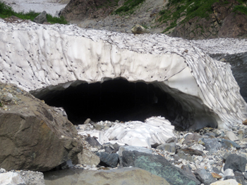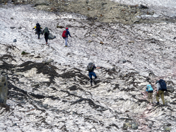 ・ 白馬尻から10分位登ったところに白馬尻小屋があり、いよいよこのコースのポイント“大雪渓”取付に到着。 ここで、アイゼンとストックを準備し、登山開始。