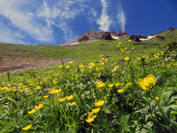 | クルマユリ | 雪渓底部空間。 背景は天狗菱 | キンポウゲ |