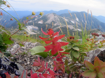 | イワギキョウ : 三国境付近 | ヨツバシオガマ : 〃 | 紅葉したイワカガミ : 小蓮華山直下 |