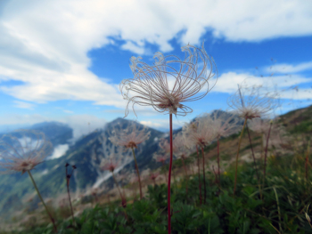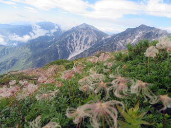 ・ 雷鳥坂を下り、白馬大池へ到着する直前には、チングルマ等のお花畑が広がっており、雪渓の冷風の影響で花期が他より遅く、まだ開花状態が残っておりユックリ写真撮影。