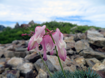 | タカネシオガマ | 高嶺塩釜 | ゴマノハグサ科、一年生 | 紅紫色 | 10 | 高さは5~15cm。茎の上部に唇形の紅紫色の花を10個ほどつける。ミヤマシオガマと比べ葉の切れ込み がそれほど細かくない点、ヨツバシオガマと比べ高さが低い。葉が羽状に1回裂けるだけで、粗く裂けている様に見え、あまり葉が目立たない。 | 〃 |
