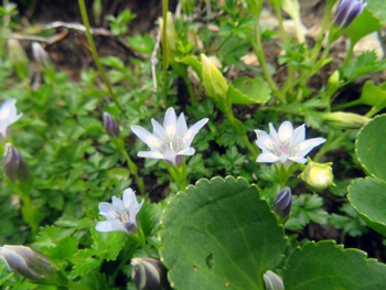 | イワツメクサ | 岩爪草 | ナデシコ科、多年生。 | 白 | 5 | 高さ5~20cm。葉は細長く3cm。 5弁花であるが、真ん中に深い切れ込みが入っているので花弁が10枚あるように見える。 | 7~9 |