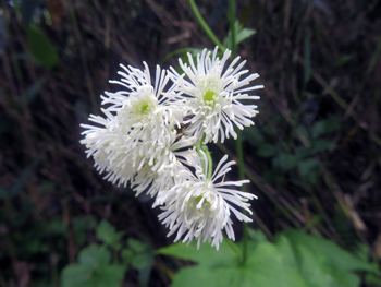 | トリアシショウマ | (鳥足升麻) | ゆきのした科、多年生。 | 白 | 若い茎、葉が鳥の足に似ていることから命名。花時には草丈30cmほど、時に1m近くになる多年草。分岐した花茎がさらに枝分かれするのが特徴です。分岐した花茎のまわりに小さな白い花をびっしりとつけます。