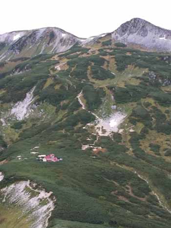 ・ 三俣蓮華小屋付近からは、真下に黒部源流が眺められました。