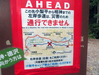 ・ 小梨平〜明神間の左岸歩道は、災害の為、通行不可、河童橋を渡って、明神橋まで、右岸を通行しました。