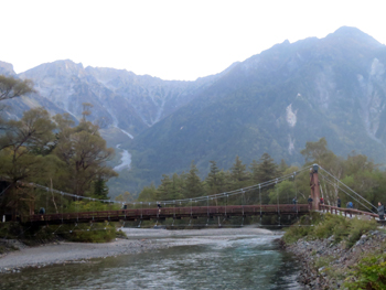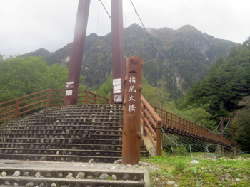 | 槍見河原からの槍ヶ岳 | 槍見河原 → 横尾 | 横尾大橋。 屏風の頭、前穂高岳 |