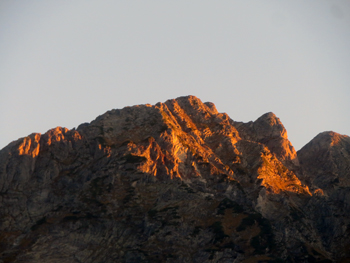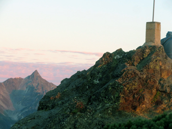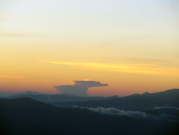 ・ 視界が開け、緩やかになり、大池が現れるとすぐに蝶ヶ岳に到着、休憩。 風下側に雲が湧き、ブロッケンが現れ撮影。 夕焼け空も綺麗でした。