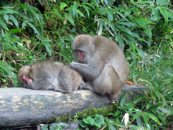 ・ 朝日に映えた明神岳のモルゲンロード等を眺めながら進み、明神橋を渡ると、猿の大群に出会いました。
