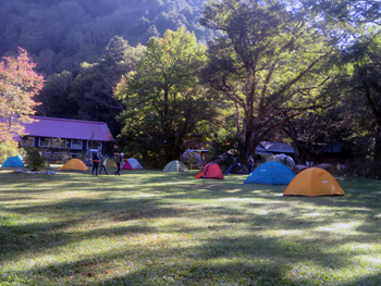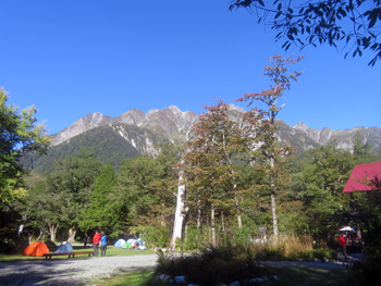 ・ 1時間ほど歩き、多くのテントが張られた徳沢に到着、休憩。