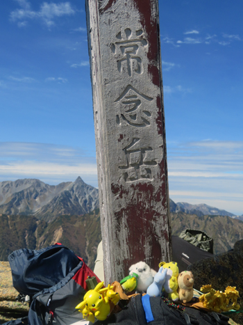 ・ 休憩後、所々で槍・穂高の展望を眺めながら、草地を進み、その後急登を登りきり、やっと常念岳に到着。 今回の登山で一番長く感じた区間でした。