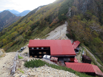 ・ かなり下って、今夜の宿「大天井ヒュッテ」に到着。