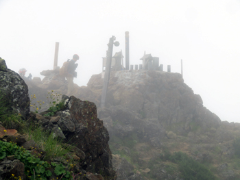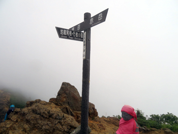 ・ ようやく視界が開け、赤岩の頭分岐点に到着。 1分で赤岩の頭、硫黄岳方面の展望写真を撮り、15分で硫黄岳山頂に到着。