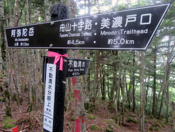 | 双葉SA付近より八ヶ岳 | 行者小屋前の分岐、中岳・阿弥陀道入口 | 阿弥陀岳 : 行者小屋より |