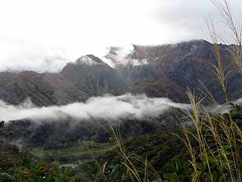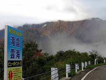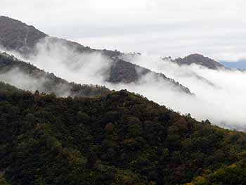 ・ 下界は奥只見湖特有の放射霧が立ち込めることが多い。 枝折峠の方から眺めると滝雲となって見える。