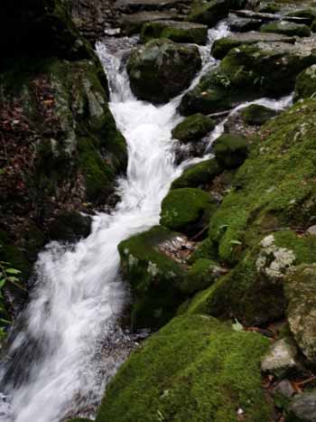 ・ 綾広の滝から七代の滝へ向かう沢沿いに続くロックガーデン。苔むした岩の間を清流が流れ落ち、夏には天然クーラーのさわやかな涼しさが体験できます。