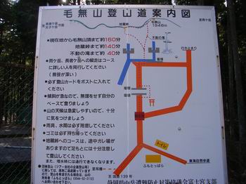 ・ ゲート脇に「毛無山山頂160分、地蔵峠140分、不動の滝40分」表示の看板地図がある。