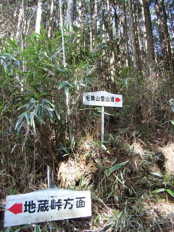 ・ やや大きな枯沢を渡り、「登山ルート」標識に従い進むと地蔵峠方面と毛無山方面の標識のある分岐に到着。