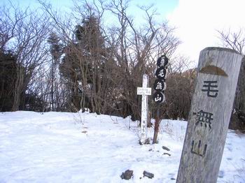 ・ 毛無山山頂は、約10cmの積雪。標識・三角点のある場所からは、富士山の展望は左右が樹木に遮られているので、前方の視界穂開けた位置から写真撮影。