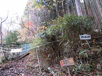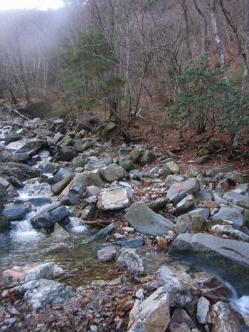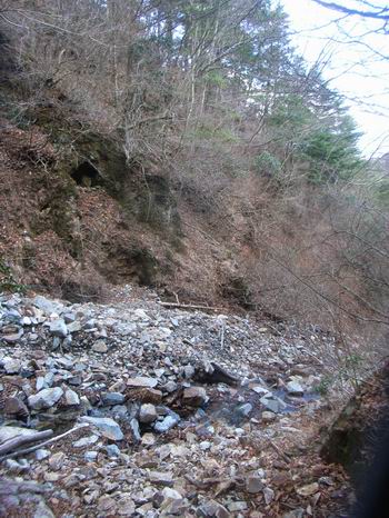 ・ 右手にあるシカ神社に参拝後、麓金山精錬所跡を右に見て、砂利道を進み、堰堤前を通り、薄くなった赤ペンキ矢印に従い左折、大きな枯沢を渡り、本格的な登山道に入る。