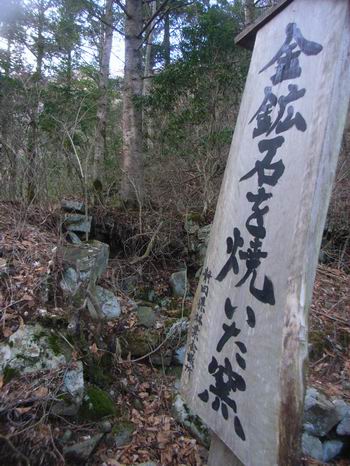 ・ 途中「金鉱石を焼いた窯」跡の看板があり、なんとなく洞窟のような跡がうかがえました。