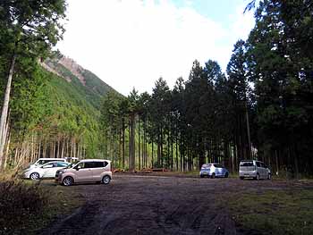 ・ 登山口にある約30台位駐車可能な有料(500円)の駐車場に駐車。先客が4台。料金を入れるポストあり、封筒に車番を記入、丸太の中をくり抜いた投入口から投函。