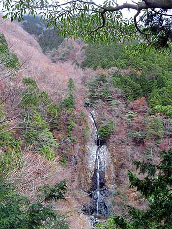 ・ 冬景色の樹林帯に入り、滝の音を聞きながらやや急登が続き、やがて二合目を過ぎるとすぐに不動の滝の見晴台に到着。右遠方に細目ながら、豊富な水量の十分落差のある見応えのある滝が目れました。