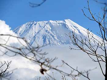 ・ 登山口に到着すると、春霞の天候は一気に北西の季節風が吹き始め、次第にスッキリ青空に変わり、穏やかな富士山が、眩しく輝いた富士山に変身。