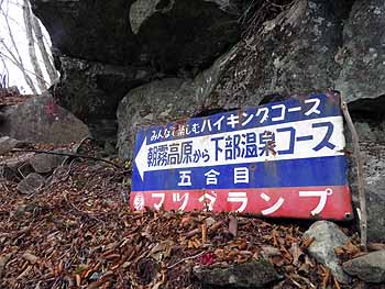 ・ 7合目からは軽アイゼンを装着、9合目からは傾斜が緩やかになり、朝霧高原分岐に到着。下部温泉への道は踏み跡少ない。