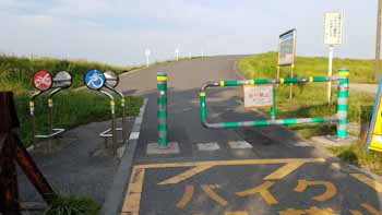 | 〃 。 約1,8Kmで、江戸川サイクリング道路到着。 ここから左側5m先に、「0Km 表示柱」あり。 | ||