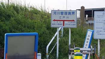 | 海から 59.25km 標識。 海から 59.5km 標識:江戸川右岸最先端。 利根川・江戸川の管理区分 | ||