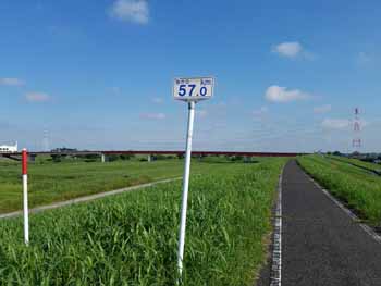 ・ 少々走ると、海から59.5Kの江戸川右岸最先端の標識。