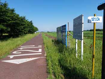 ・ コースを道なりに、右にカーブしながら進むと、その少し先に、海から121Kmの表示柱と、管理境界線の案内板がありました。