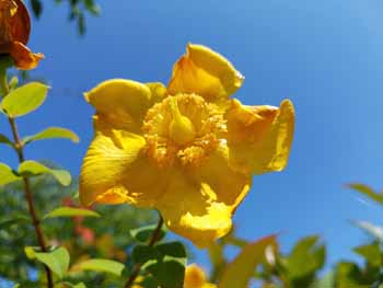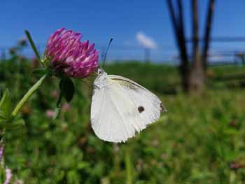 | にこにこ水辺公園のキンシバイ(ヒドコード、ビヨウヤナギ)。 アカツメクサ&モンシロチョウ | ||