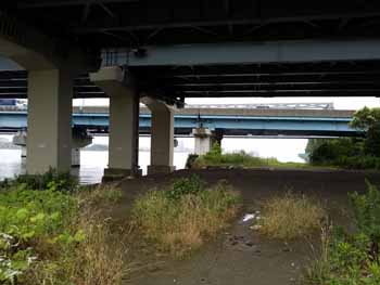 ・ SRをそのまま約100m程上流へ進むと、「海から0.5Km」の標識があったので、下流へ戻って、SR始点の先から草地の江戸川右岸に立入、最先端の京葉道路の下迄行き撮影。 海から約0.4Km地点。