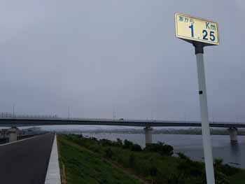 ・ スタートして、約2.5K程で、旧江戸川分岐の水門を渡ると、「海からの距離」表示数値が、旧江戸川からの距離の為、一気に約6Km加算されてます。