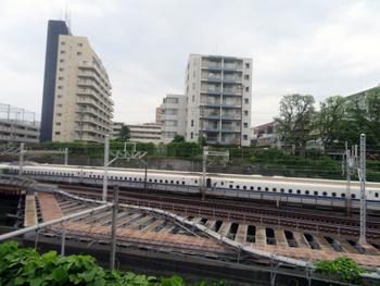 ゲートシティー大崎  〃 モニュメント  ビル街  & 新幹線  大崎 → 品川  : 御殿山ヒルズ庭園