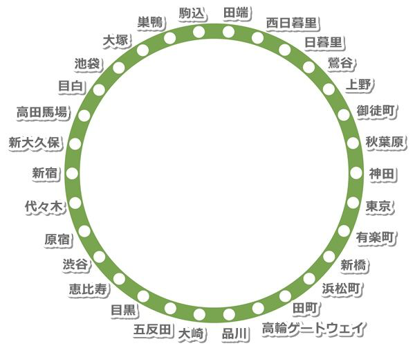 駒込駅 → 巣鴨駅 → 大塚駅 → 池袋駅 → 目白駅 → 高田馬場駅 → 新大久保駅 → 新宿駅 → 代々木駅 → 原宿駅 → 渋谷駅 → 恵比寿駅 → 恵比寿ガーデンプレイス → 目黒駅 → 五反田駅 →