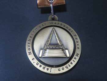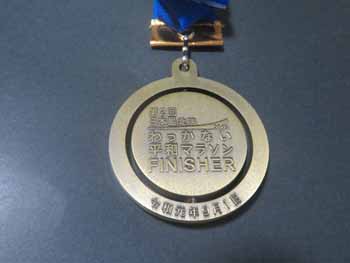 ・ 街中での盛大な応援を受けながら、ほぼ予定通りの5時間弱でゴール、中学生に完走メダルを首にかけてもらい、チップを外してもらい、完走証を受けてって、競技場外野へ戻り着替えました。